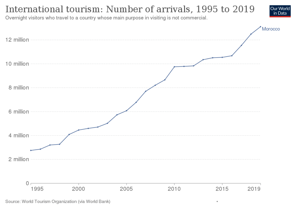 Morocco tourism arrivals jumped from less than 1.5M in 2005 to 12.5M in 2019 just before covid hit the world .